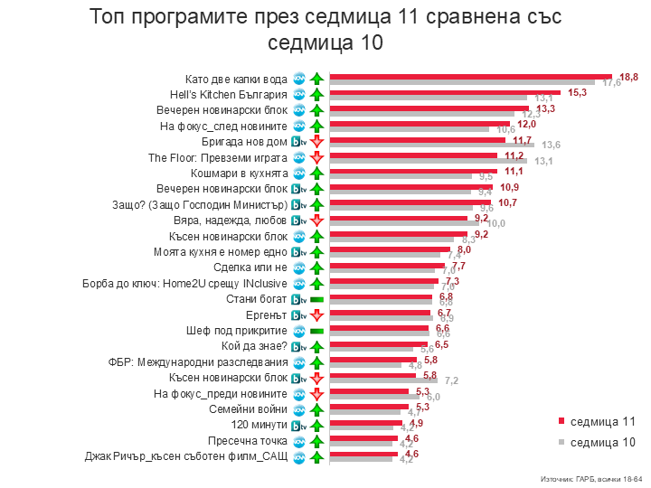 Начело на красацията си остава несменяемият лидер на сезона „Като две капки вода“, с рейтинг доста над всички останали топ програми, показващ устойчивия интерес към формата на близо една пета от българите в активна възраст 18-64 години. На следващите три позиции също са програми на Нова телевизия, а на пето място е „Бригада нов дом“ – най-гледаното предаване на бТВ този сезон. Следват още две заглавия от прайм тайма на Нова – „The Floor: Превземи играта“ и „Кошмари в кухнята“.
