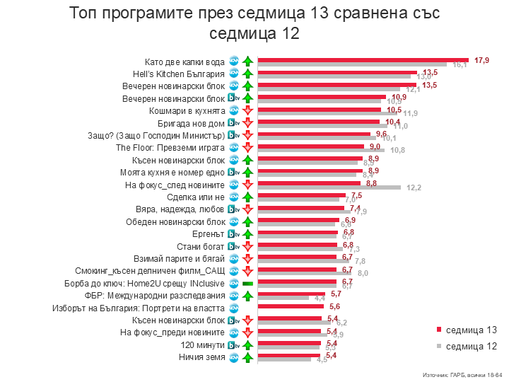 В топ програмите веднага прави впечатление, че сред най-гледаните пет има две емисии новини. Приближаващите избори може да са обяснение за това. Интересно е да се отбележи, че докато в по-широката зрителска група 18-64 години новините са на трето и четвърто място, както се вижда в класацията, то за по-младите хора от 18 до 49 години новинарската емисия на Нова телевизия във вторник е на второ място, преди Hell’s Kitchen. Независимо от високата дигитална активност в тази възрастова група, новините по телевизията си остават институция. Иначе „Като две капки вода“ за поредна седмица е несменяем лидер, с ръст в резултатите и видимо по-добри рейтинги от всички съперници. Следва Hell’s Kitchen и новините на Нова, на четвърто място са новините на бТВ, а най-популярният им риалити формат за сезона „Бригада нов дом“ – на шесто. „Кошмари в кухнята“ и „The Floor: Превземи играта“ остават в горната половина на класацията, макар и с известно намаление в рейтинга. По-малко е гледано тази седмица и интервюто на Лора Крумова в „На фокус“ след централната емисия новини, където е гостувал режисьорът Димитър Коцев – Шошо. Намаление има и в рейтинга на „Защо, господин министър?“, където гост е бил служебният министър на Министерството на околната среда и водите Юлиян Попов. Цялостно в гледаемостта на топ програмите има различна динамика, като в топ десет продължава да доминира Нова телевизия, а по-голямата част от топ предаванията на Нова имат ръст в рейтингите.