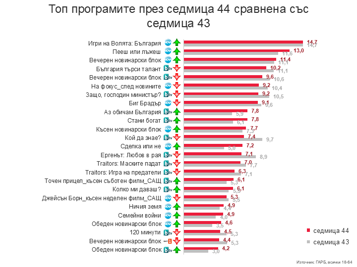 Средноседмичните рейтинги за периода 27 октомври – 2 ноември намаляват още малко спрямо предходния период, с което слизат под миналогодишните. Тази тенденция е наобратно на миналата година, когато октомври е бил с по-ниски рейтинги и към ноември гледаемостта се е увеличила трайно.