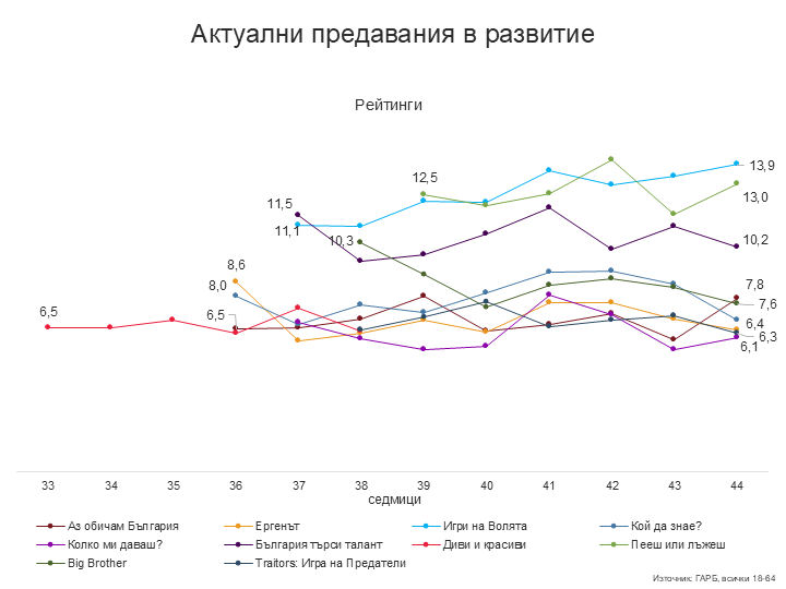 По-големи девиации има в предаванията на бТВ, като „Аз обичам България“ и „Стани богат“ имат видим ръст, докато „Кой да знае?“ и „Ергенът – любов в рая“ имат по-ниски резултати тази седмица.