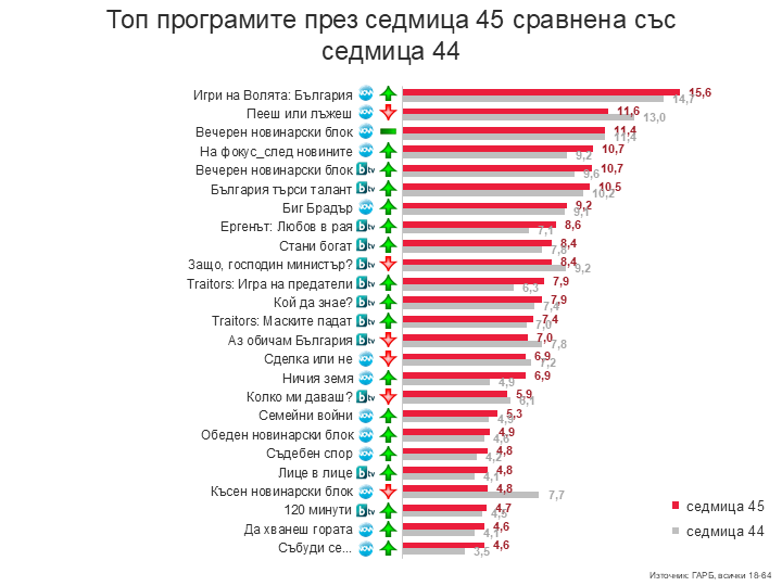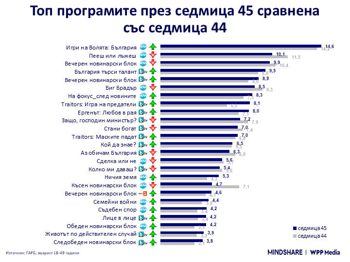 Тази положителна динамика личи в рейтингите на топ предаванията, повечето от които растат. Първите три места остават непроменени – лидер е „Игри на волята: България“ с епизода в сряда, следва „Пееш или лъжеш“ и новинарският блок на Нова телевизия във вторник. Следва „На фокус с Лора Крумова“ с гост министърът на вътрешните работи Иван Демерджиев. След тях е новинарският блок на бТВ в понеделник и „България търси талант“, след което е „Биг брадър“ и „Ергенът: Любов в рая“ с ръст на рейтинга от над един процент.