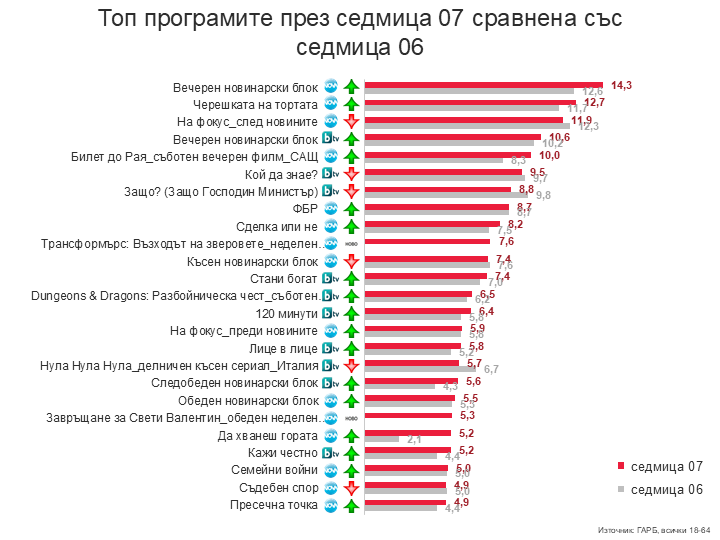 Класацията на топ предаванията не предлага изненади, а обществено-политическата ситуация извежда новините на челни места, като на първо място е новинарската емисия на Нова телевизия в понеделник вечерта, а на четвърто са вечерните новини на бТВ в същия ден. На второ място се класира „Черешката на тортата“ в понеделник, а на трето разговорът на Лора Крумова с цигуларя Васко Василев в предаването „На фокус“.